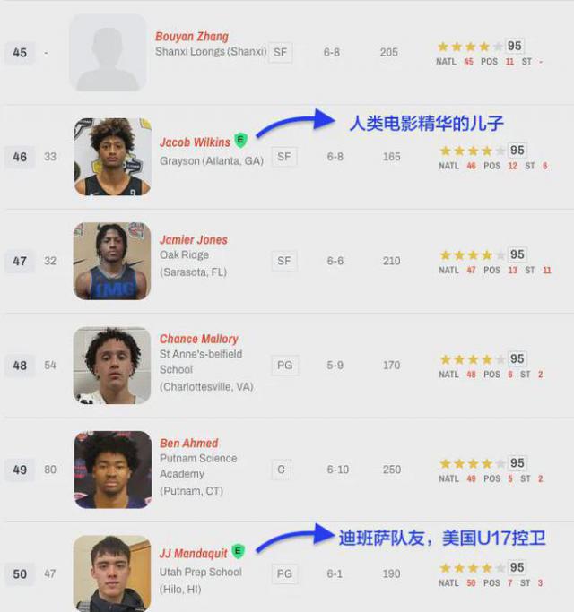 还有一条信息可以让我们了解张博源目前的天赋水平,有两个不同的选秀网站,一个列出了 07 级最好的 10 著名的国际球员,张博源并没有在这里,而是获得了荣誉提名。另外一个是 2025 全球高中生排名,张博源排名第一。 45 位。