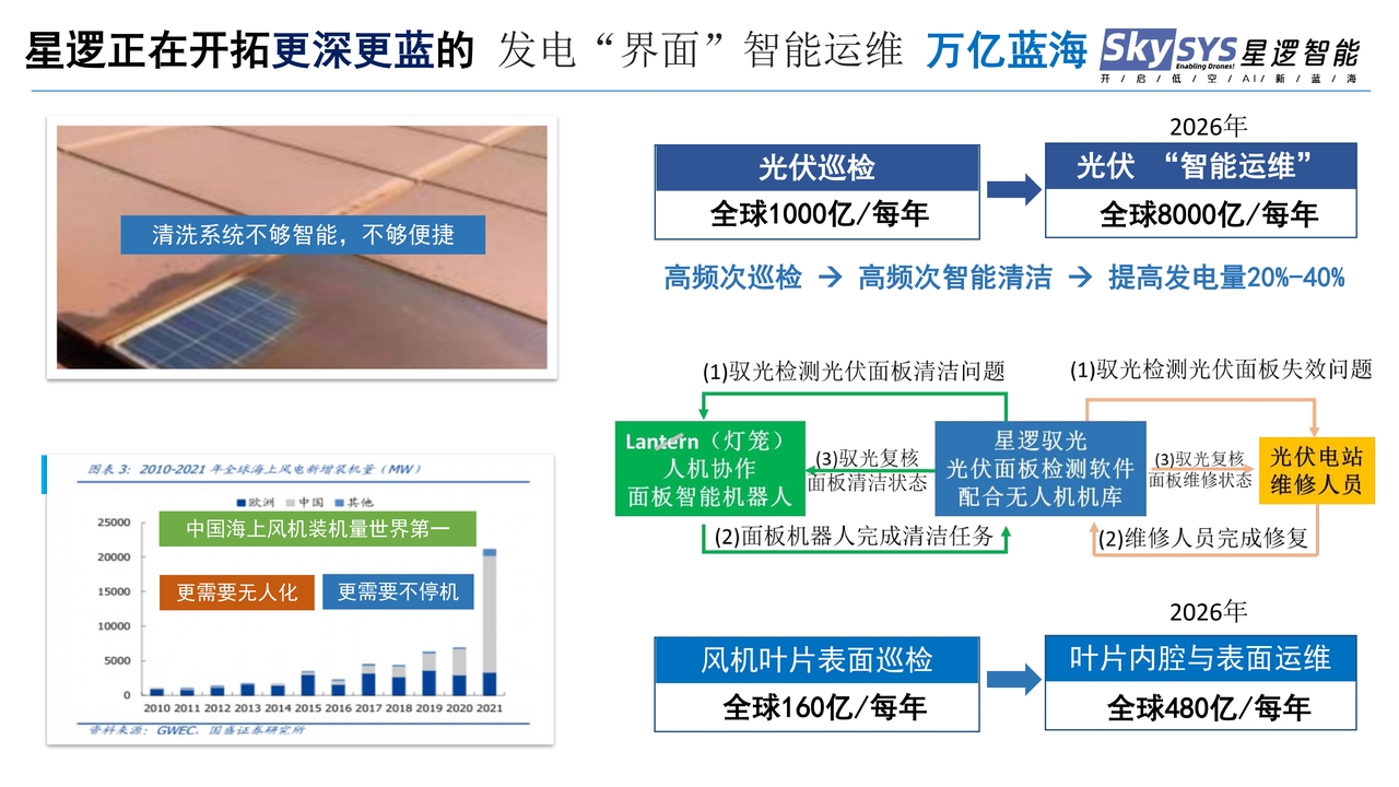 最后,王海滨强调,低空经济不仅仅是创造新的场景和产品类别,更重要的是利用无人机技术处理现有产品的困难,提高劳动效率和发电效率,满足市场需求。预计到2026年,全球光伏和风力发电检测和运行维护市场将达到8000亿。目前,星逻智能光伏检测系统已覆盖全球约460个光伏站,总容量约9G瓦,成功挑战了海上光伏检测和国外市场服务的难点。未来,星逻智能有望与新能源、电力等行业的客户建立合作关注海外机会,共同推动智能运维的发展。