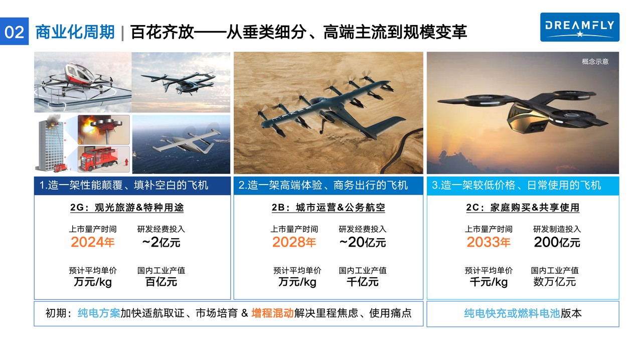 商业周期和空中交通市场规模:蔡文宽展望未来空中交通的愿景,形成基于移动终端和轻基础设施的分布式点对点网络,拓展城市边界,实现自由飞行,满足人们对美好生活的向往。作为一个战略性的新兴产业,他认为,新质生产力将在十年内达到万亿规模。现在正处于第一阶段,产品主要满足观光旅游、特种物流运输等细分领域的需要。预计2027年左右将实现第二阶段,公务或共享出行版将投入使用。