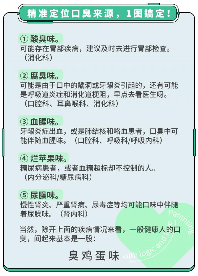 PS:扁桃体炎症、化脓等因素引起的,也会引起口臭。所以有时候孩子生病的时候,宝妈们也会感觉到孩子的口臭。