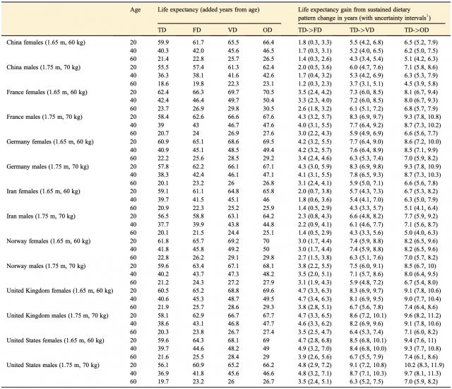 假如一直保持典型的饮食方式, 个国家的 20 年龄女性的预期寿命范围如下? 59.1-62.4 岁,20 年龄男性的预期寿命范围如下? 55.5-59.6 岁。而到了 60 年纪大了,如果还坚持典型的饮食,60岁。 岁时女人的 LE 从伊朗的 20.9 岁至法国的 23.7 岁不等,60 岁时男性的 LE 从中国的 18.6 到挪威的年龄 21.2 岁不等。