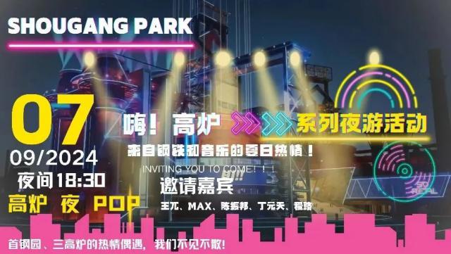首钢三高炉承载铁色记忆 9.7 米平台和秀池区,对公众开放夜游!继前两场比赛之后「热情摇滚」和「民谣之夜」后,火爆的「流行歌曲」将要袭来!9 月 7 日(周六)18:30 石景山首钢园「嗨!高炉」第三场“高炉夜游”系列夜游 POP "来啦!“共游音乐人”阵容再次升级!原创流行歌手如“中国好歌”亚军王兀、伯克利音乐新秀丁元天等将现场演唱!陈振邦、花椒乐队主唱在过去的活动中非常受欢迎。 MAX 又一次回到现场,带给我们动感的流行节奏!