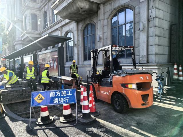 3 几天下午,记者在道里区友谊路防洪纪念塔公交站周围看到,道路两侧的路缘石已经基本铺好,大部分都是原来的黄色路缘石。工人们正在拆卸人行道上的步道板并堆叠起来。