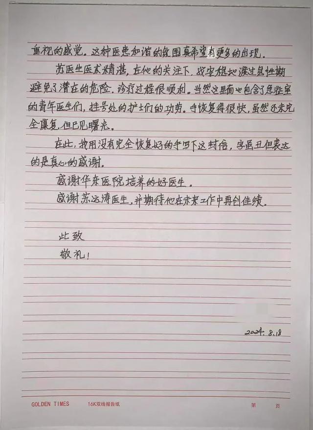 为了表达感激之情,杨奶奶给华东医院急诊创伤中心写了一封感谢信,向苏远涛副主任医师表示衷心的感谢,并对其及时专业的治疗表示赞赏。