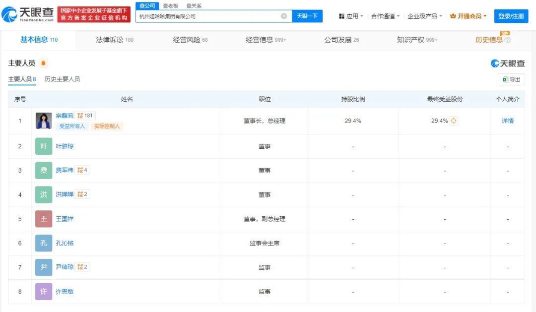 今年2月,宗庆因病去世,享年79岁。随后,宗馥莉走上前台,接管了杭州娃哈哈电子商务有限公司、浙江启力投资有限公司等20多家公司的法定代表人职位。