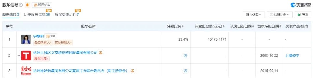 股权渗透显示,宗庆退出股东队伍后,杭州娃哈哈集团有限公司由宗馥莉、杭州上城区文化商务旅游投资控股集团有限公司、杭州娃哈哈集团有限公司基层工会联合委员会(员工持股会)三名股东共同持有。目前宗馥莉29.4%,接手宗庆后的娃哈哈集团股份。