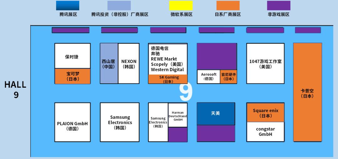 如果在几个主要展厅上标注不同的颜色,你会发现科隆游戏展至少形成了三股力量。微软的展位几乎占7号馆的一半;以卡普空为代表的日本厂商依然强势,新作《怪物猎人》也是排队最多的展位之一;最后是中国厂商,其中腾讯加在一起,有与海外大厂商抗衡的趋势。