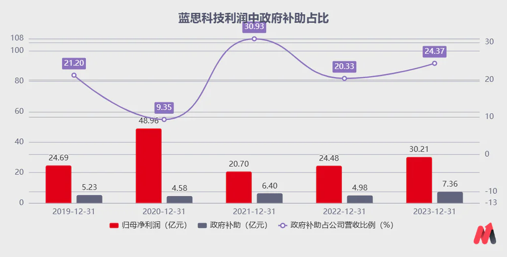 2023年,蓝思科技实现了归母净利润30.21亿元,其中7.26亿元来自政府补贴,占公司总利润的24.37%。相比之下,2023年立讯精密政府补贴分别占公司总利润的不到7%。如果政府补贴减少,将对公司业绩产生显著影响。