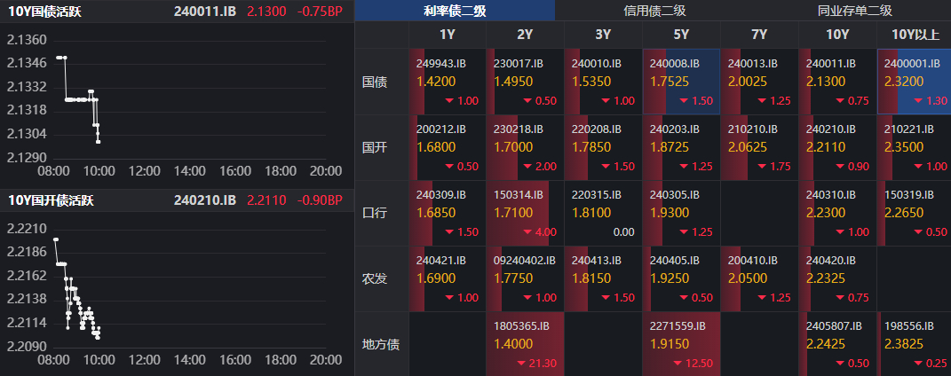 银行间现金券总体上涨,中端表现出色,5年“24附息国债08”下跌1.75bp报1.75%,7年“24附息国债13”下跌1bp报2.005%。