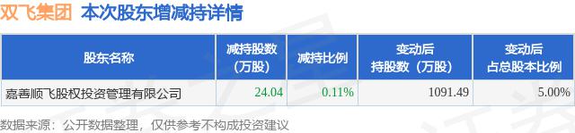 证券之星消息,9 月 4 双飞集团发布公告《双飞集团》 : 双飞无油轴承集团有限公司股东嘉善顺飞股权投资管理有限公司于于公司部分董事股份减持计划期满及减持结果的通知 2023 年 9 月 1 日到 2024 年 9 月 4 白日合计减持 24.04 万股,目前占据公司总股本 0.1101%,股票在变化期间下跌 17.25%,截至 9 月 4 日收盘报 10.84 元。