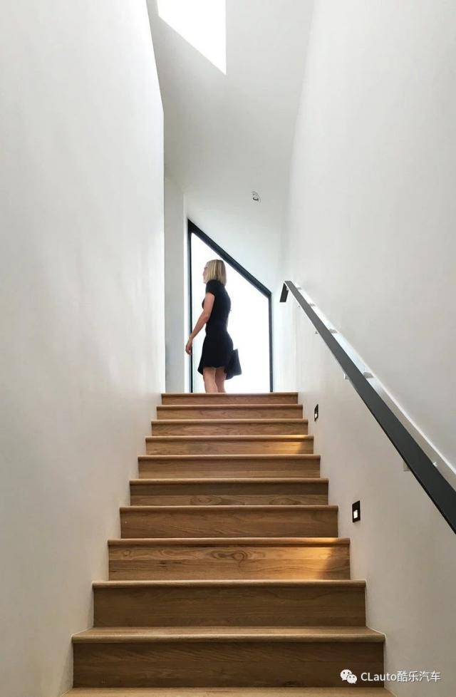 楼梯顶部有一面巨大的黑框玻璃墙,可以看到下面的车。画上方的天窗也开得恰到好处,引入自然天光补充室内照明,强调画的美感。