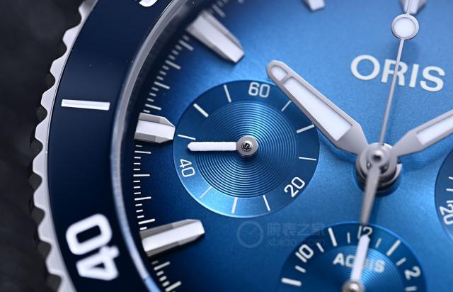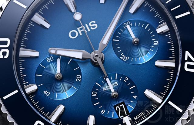 就像我前面说的,这个新产品的潜水记时盘做成了渐变蓝。它从表盘的中心扩散到周围,仿佛阳光照射在水面上,透过海底。同事上手的时候,整个盘面质感都是从任何角度欣赏的,尤其是在光线下。因为表盘经过了太阳辐射图案的处理,它的蓝色更加耀眼。