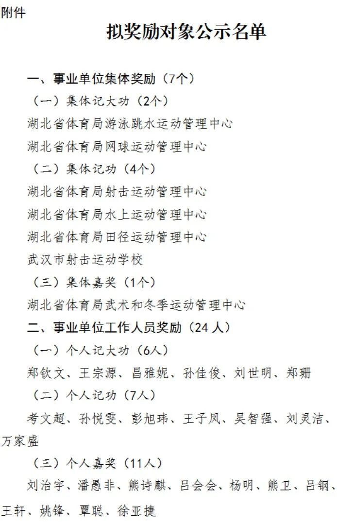 根据《事业单位工作人员奖励条例》和《湖北省重大体育竞赛奖励办法》,省人力资源和社会保障厅、省体育局拟分别对24名在第33届夏季奥运会上表现突出的事业单位工作人员和7家事业单位给予大功、记功和奖励,现将公示拟奖励目标(公示名单附后)。