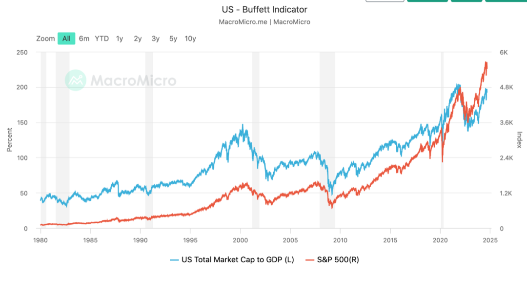 (巴菲特指数为蓝色 标普500指数为红色。 来源:MacroMicro)