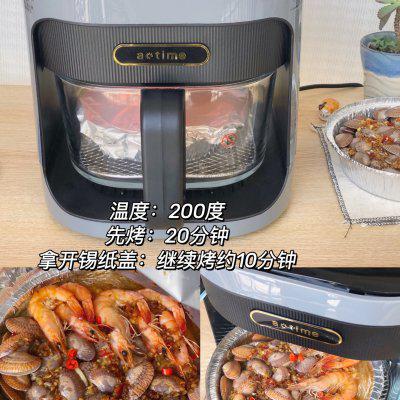 5、放入澳特美空气炸锅,温度 200 度,第一次先烤 20 分分钟,取出锡纸盖,然后继续烤越来越多。 10 几分钟后,花甲全部张开。