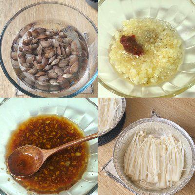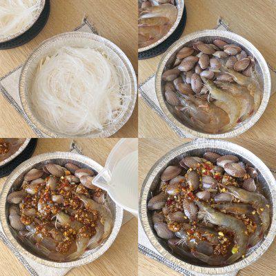 3、粉丝用清水泡软,虾去虾线。 将金针菇、粉丝、花甲、虾放入锡纸盘中。 将酱料均匀地铺在花甲上,加入适量的水,⚠️水差不多泡过食材