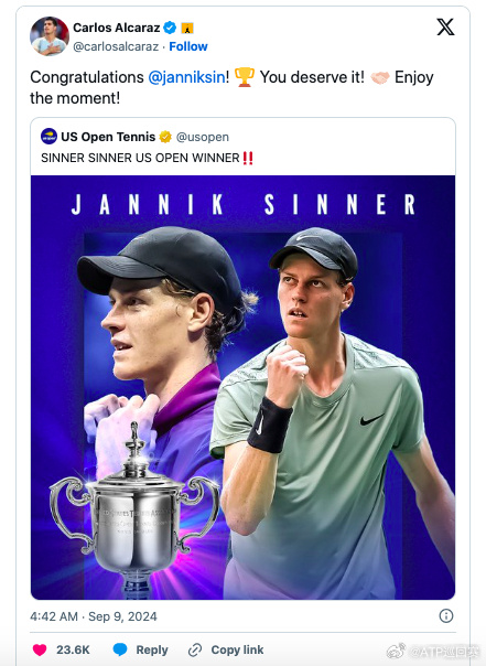 在美国网络决赛之后,阿尔卡拉斯也在第一时间向辛纳致以祝贺。一个新的网球宿敌抵抗故事,或许已经开始了。