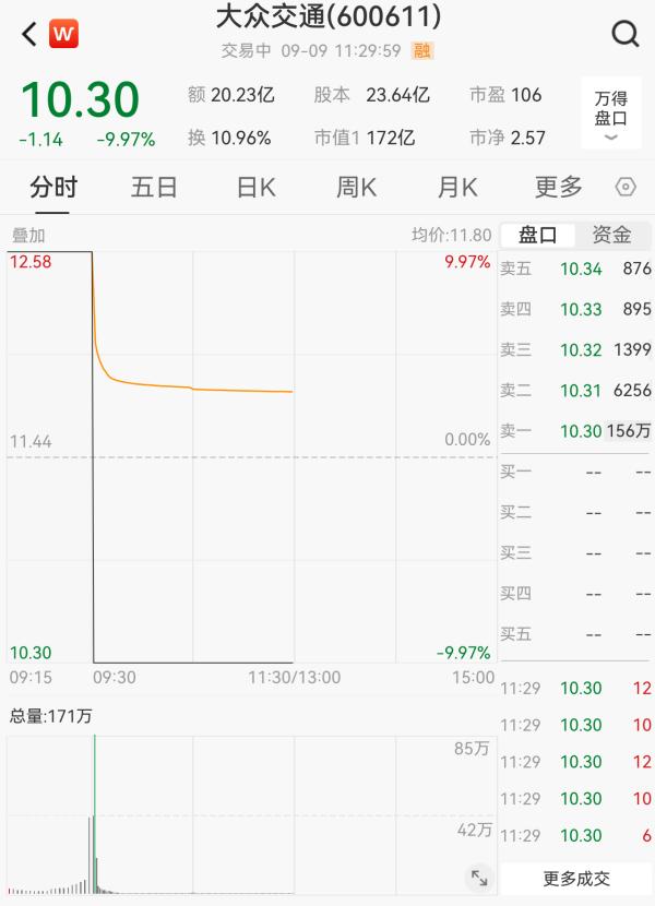 九月九日,大众交通开盘时涨停,成交额近18亿元,随后直线下跌。截至中午收盘,大众交通下跌9.97%,收于10.30元/股,收于156万多手,总市值243.5亿元。