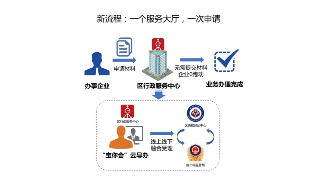 区确权登记中心、区政务服务中心、区市场监管局为了快速响应企业需求,实现“发现一个问题解决一类问题”的工作目标,积极研究解决方案,从“畅通办理渠道,优化流程阶段”的角度重新设置了业务查询“路线图”。也就是说,选择“宝你会”云导办公室,依托虚拟窗口,将三个单位的政务服务窗口串联起来,通过线上线下整合帮助,免去从公司到登记窗口获取材料的流程。公司可以直接在工商窗口完成业务,减少企业经营的频率。