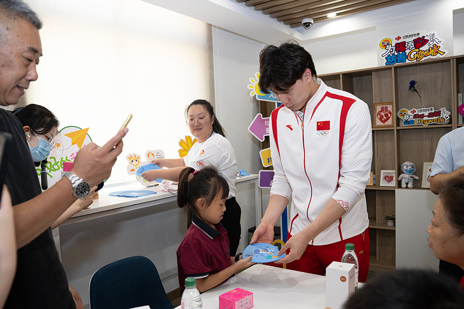 当天,在“祝福满满,共庆中秋”的敬老爱幼活动中,海洋与正在学习剪纸课程的老人和自闭症儿童进行了交流和互动,并赠送了一顶签名的泳帽。老人和孩子们也很高兴看到奥运冠军。他们感谢奥运运动员为国家增添光彩,回报他们的剪纸作品。