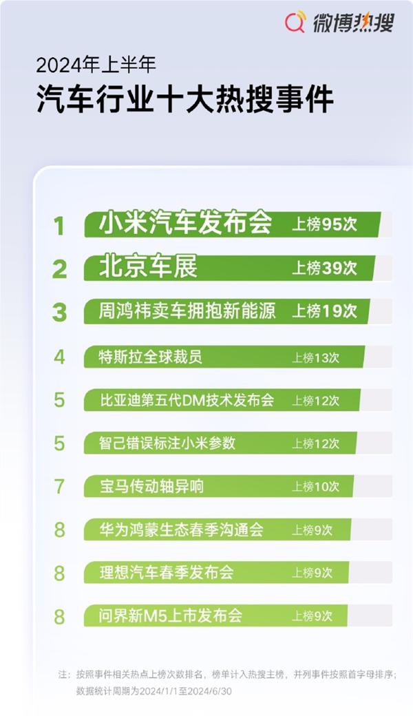 2024年上半年,汽车行业十大热搜品牌发布:小米第一 远远领先于特斯拉