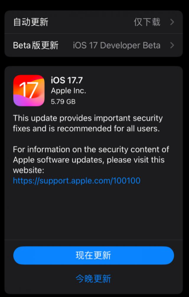 此外,iOS 17.7 的 RC 今天版本也向用户推送。