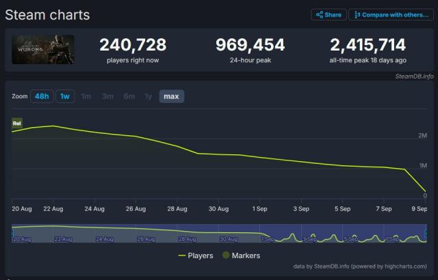 根据 SteamDB 最近的数据显示,虽然《黑神话》系列的在线玩家数量呈稳步下降趋势,但其数量却呈稳步下降趋势, 24 玩家在一个小时内的峰值仍然接近百万的价格,这对于一款只上市三周的新游戏来说,能够一直保持如此高的活跃度和吸引力是非常有价值的。