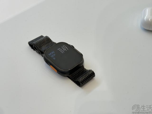 但这里也有一个有趣的细节,那就是与之相关。 Apple Watch Ultra 2 搭配黑色米兰尼斯表带,这次采用了类似背包带的金属卡扣设计。与过去苹果常用的磁扣相比,更传统的锁扣自然有更好的固定力。只是这种“硬核”的细节组合了“服装”风格的米兰尼斯表带,有些“混搭”。