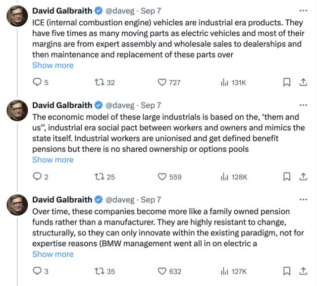 他说,电动汽车似乎和德国制造的燃油车没什么区别,但从生产设计、商业模式和利润结构来看,完全是两个物种。以下是高伯瑞斯在社交媒体上发表的评论原文。
