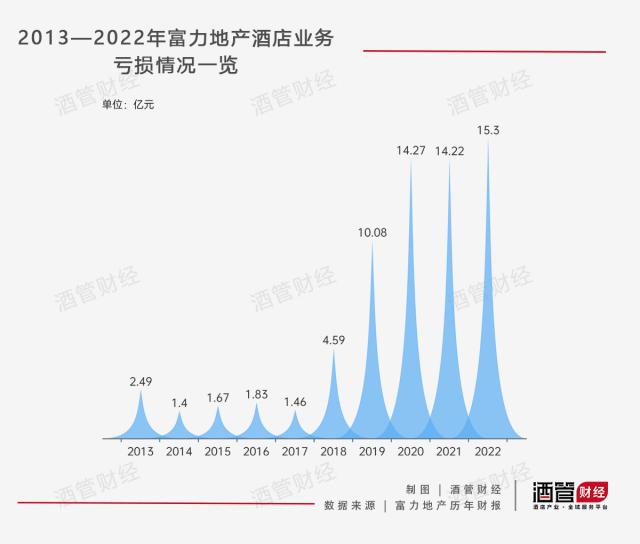 2018 年— 2022 2000年,富力地产酒店业务亏损分别为 4.59 亿元、10.08 亿元、14.27 亿元、14.22 亿元、15.3 亿元。