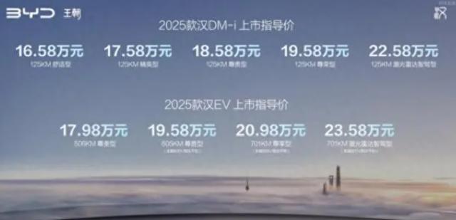 2024 年 9 月 9 日,比亚迪 2025 款汉上市,共同推出 9 汽车;其中,汉 DM-i 五款,价格区间 16.58-22.58 万元;汉 EV 共有四款,价格区间 17.98-23.58 万元。