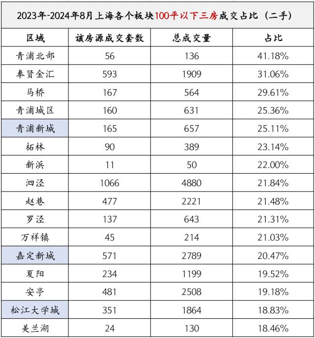 青浦北部最高,2023 年至 2024 年 8 月,100 平下小三房的成交比例高达 41.18%