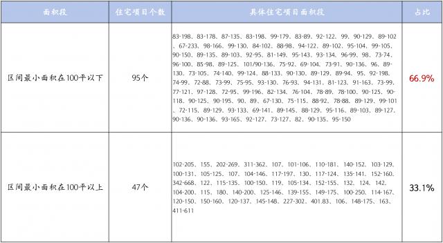 142 个别项目中,最小区间面积在 100 平下项目包括 95 个,占比 66.9%