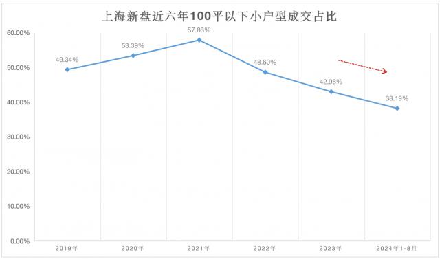 特别是最近四年,从高点开始。 57% 掉落到 38%,小户型的成交比例不断缩小。