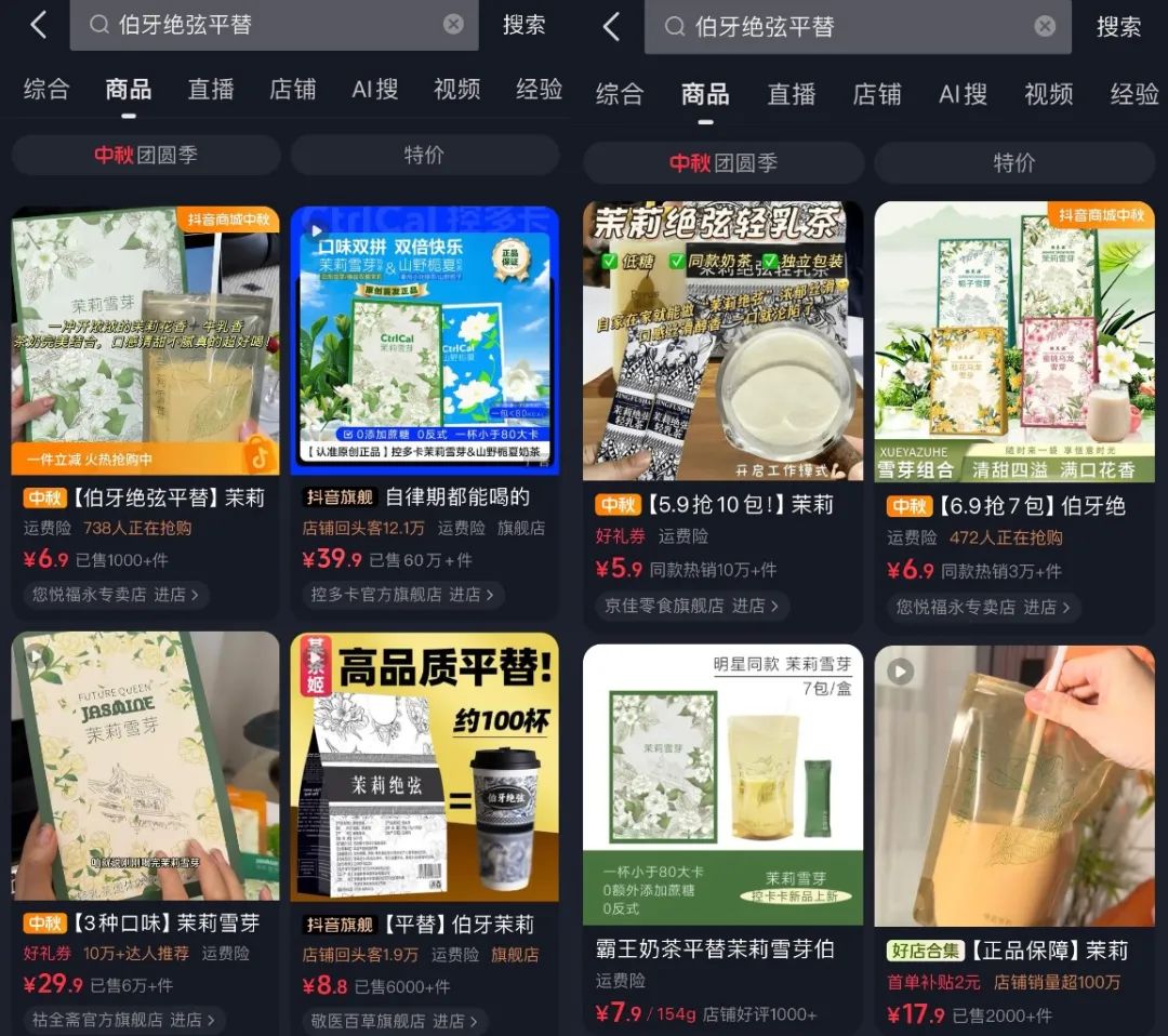 随着伯牙绝弦“平替”茉莉的流行,很多敏锐的商家也看到了机会。品饮汇发现,很多同样的奶茶产品在抖音平台上开始涌现,其中销量最高的控多卡已经在全网卖出了1300万袋。