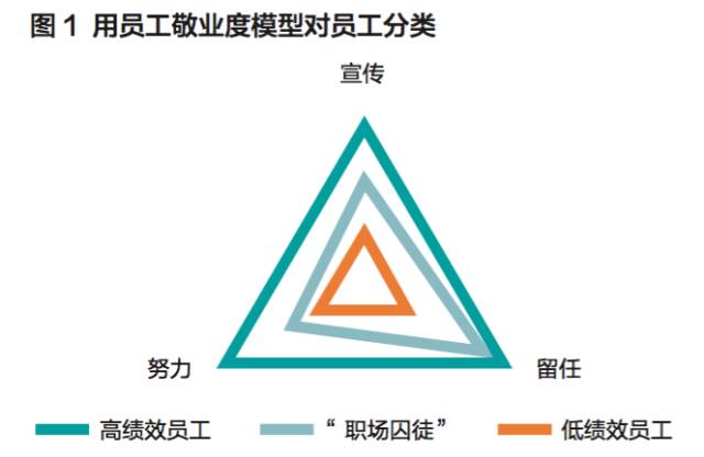 员工敬业模式包括宣传、留任和努力三个维度。宣传是指员工愿意与同事交往,尤其是顾客对公司的高度赞扬。留任是指员工有强烈的愿望成为公司的一员。努力工作就是评估员工是否愿意为公司的成功而工作。与业绩两极的员工不同,“职场囚徒”在专业模式三个维度上得分最低,“职场囚徒”几乎不愿意为企业付出更多的努力。但是他们对公司更有感情,在某些情况下,他们也愿意宣传自己的公司。与此同时,我们发现,“职场囚徒”最显著的特点就是在留任维度上表现出强烈的愿望(图) 他们非常不愿离开他们所在的企业。