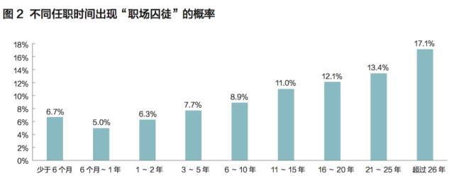 从就业时间的角度来看,职业通道设计不合理是造成“职场囚徒”的原因之一。我们发现“职场囚徒”一般都是公司的中层管理者,他们在一个岗位上呆的时间太长,对业务已经很熟悉了。同时,他们失去了进一步提升业绩的动力,因为他们没有晋升的希望。另外一种情况是“业绩优秀”的高绩效业务人员担任中层管理者,这类员工也很容易成为“职场囚徒”。这是因为他们的业务水平很高(比如销售、科研、开发),但对管理并不熟悉。如果企业不给予他们必要的支持,这样的人很容易因为不能完全胜任工作而感到疲惫。但是,另一方面,作为中层管理者所获得的声誉、收入等实际好处,使他们不愿意主动离开自己的企业或职位。