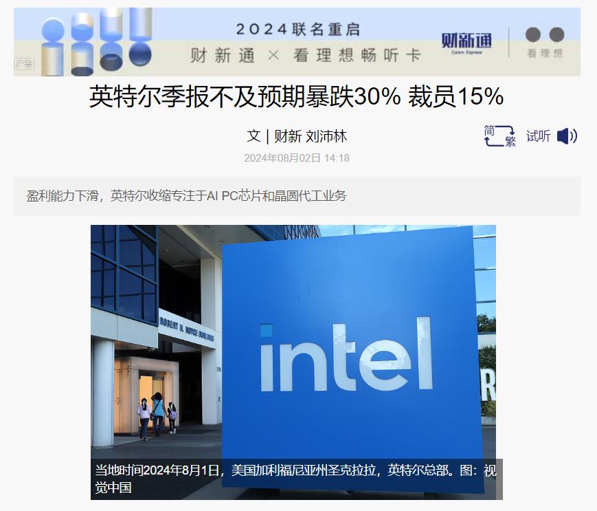 英特尔裁员的原因自然是财务表现不佳。今年第二季度,英特尔亏损。 16.1 亿美金。