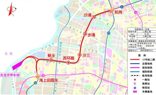 地铁 12 号线二期线路由 12 号线一期工程终点 � �海上田园东站 介绍,沿丰民路、牡蛎乡路、沙井路、沙江路铺设,最终到达 � �松岗站。