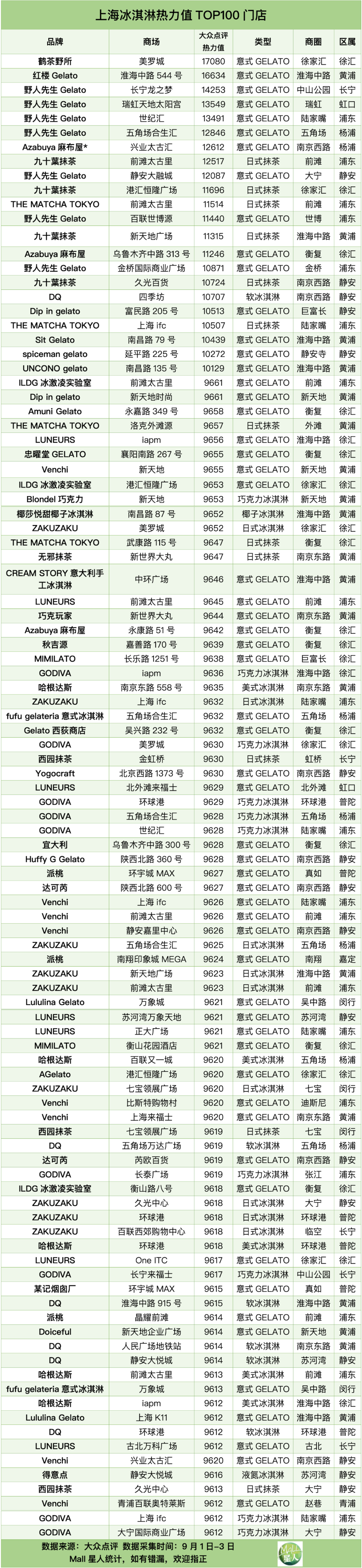 目前,上海有1000多家冰淇淋店。根据公众评论的冰淇淋店的热值,Mall的人统计了上海最受欢迎的10%冰淇淋店。