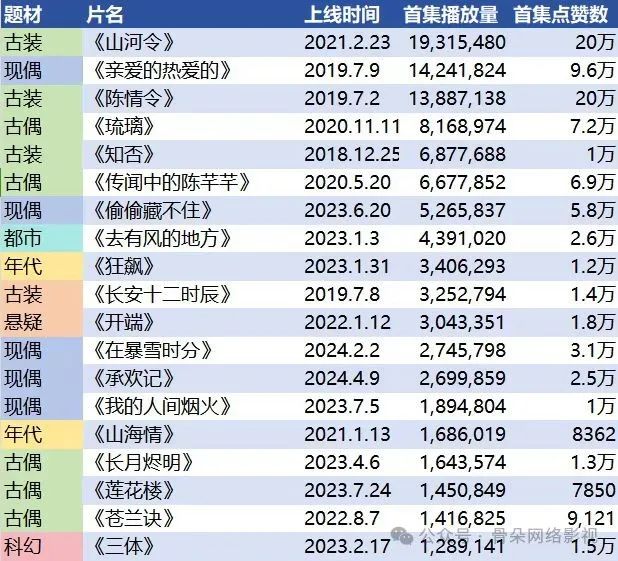 在Youtube上,骨朵统计了近五年国内热播剧集的首集播放情况: