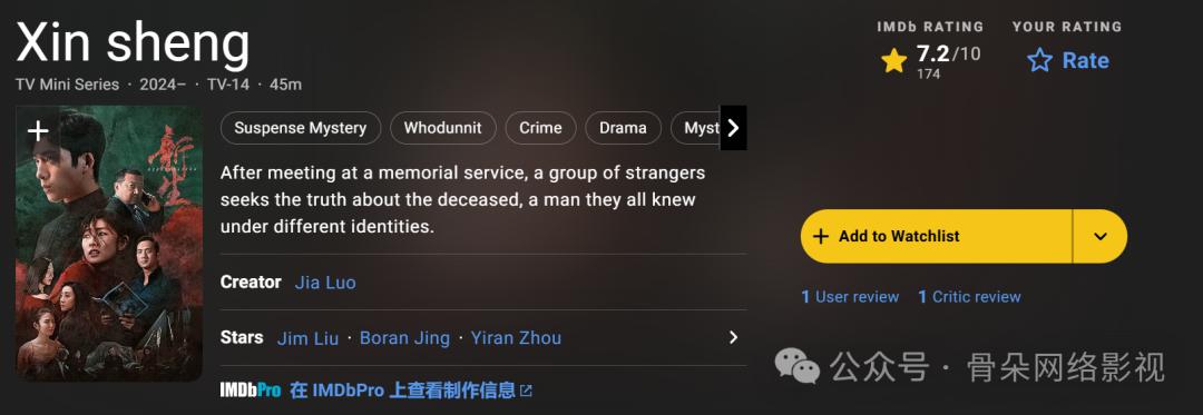 在过去的两年里,国剧也开始制作“迷你剧”类型。比如《新生》已经在油管播放了85万次,同时在Netflix播出。海外网站My Drama List得分高达7.2,取得了不错的成绩。所以格式问题并不难解决。