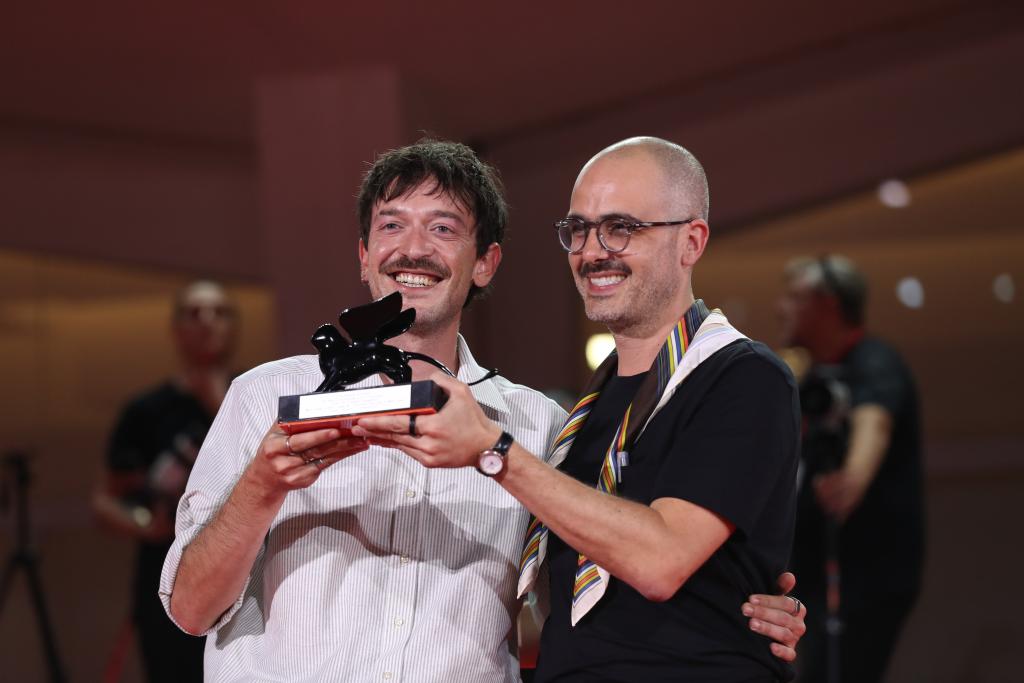u2003u20039月7日,凭借电影《我还在这里》获得最佳编剧奖的穆里洛·奥塞尔(右)和埃托尔·洛雷加与意大利威尼斯合影。新华社记者 李京 摄