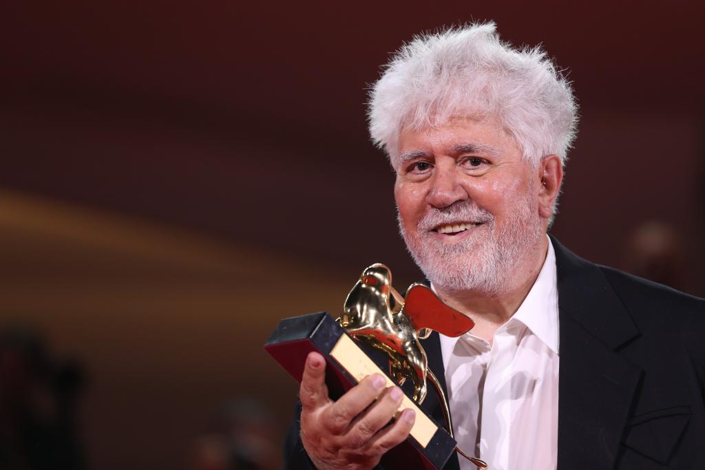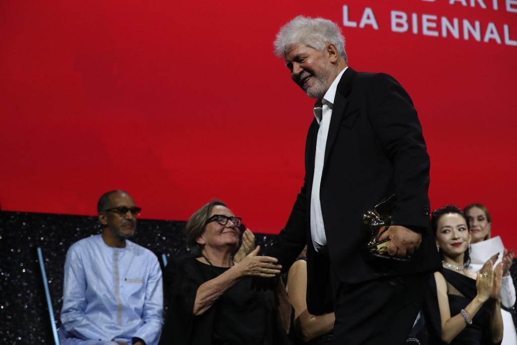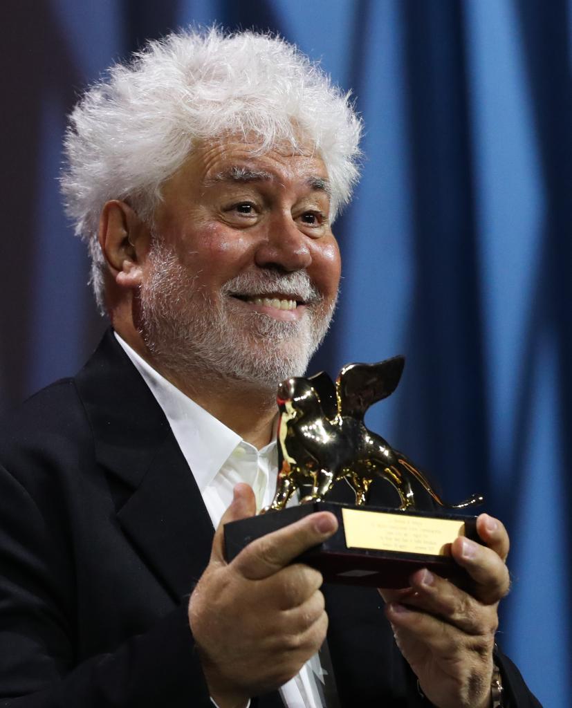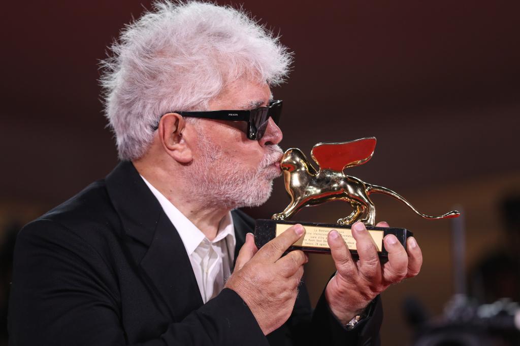 U2003u20039月7日,西班牙导演佩德罗·阿莫多瓦在意大利威尼斯与金狮奖牌合影,获得电影《隔壁房间》最佳电影金狮奖。新华社记者 李京 摄