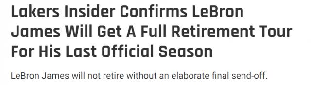 "勒布朗(詹姆斯)今年夏天签了一份续约合同,但是这份合同只有一年的保证期(第二年是球员的选择)," McMenamin 说道。“但是我不认为他的职业生涯即将结束,他也不会因为湖人整个赛季表现不佳而离开湖人,退役。在勒布朗的最后一场比赛到来的时候,他会按照自己的时间表做事。 …… 众所周知,这将是必看的电视栏目。勒布朗的退役巡演将走遍全国 28 个 NBA 这座城市,最后以一场精彩的告别赛结束。"