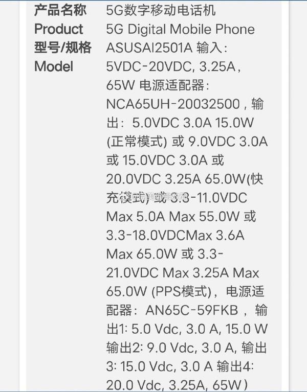 【CNMO 近年来,随着智能手机市场的逐步饱和,只有红魔和华硕在游戏手机细分领域不断深化,开发高性能游戏手机。最近,CNMO 留意到,ROG 游戏手机 9 已经通过认证,型号为" ASUSAI2501A ",确定支持 65W 快速充电。
