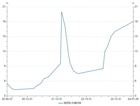 2020年4月至2024年7月,俄罗斯央行关键利率走势