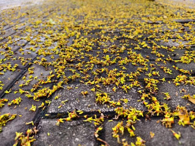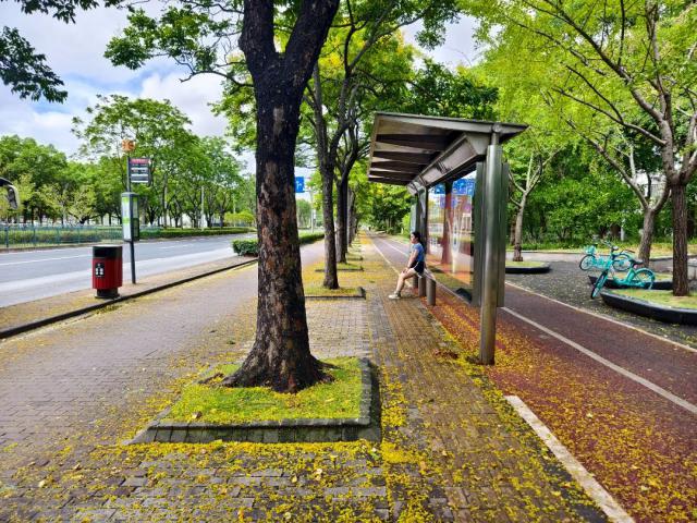 一夜风雨过后,这些“金花树”的许多小花落在地上,人行道仿佛铺上了一层“金地毯”,公交候车亭也打扮得浪漫可爱。