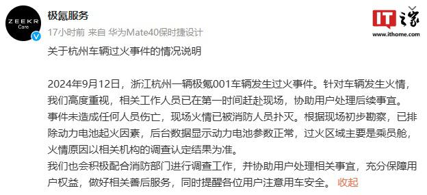 IT 世家 9 月 14 日消息,极氪官方于 9 月 13 “关于杭州车辆过火事件的说明”日发布。:2024 年 9 月 12 日,浙江杭州一辆极氪。 001 车辆发生火灾事件。对于车辆发生火灾,公司高度重视,有关人员已在第一时间赶到现场,协助用户处理后续事宜。
