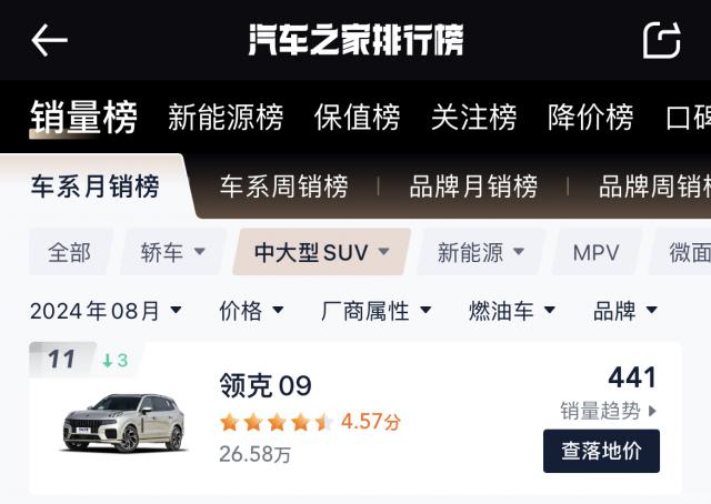 据 8 月度汽车之家销量榜,领克 09 以 441 中大型燃油台成绩位居中大型燃油台 SUV 销量榜第 11 名。纵观领克 09 所在的中大型 SUV 市场上,许多以前主要推广实用性、造型魁梧、三排空间的车型,纷纷推出“大五座”车型。两排五座的布局不仅给后排乘客带来了更宽敞的腿部空间,而且在一定程度上提高了后备箱的装载能力。对日常使用场景涉及不到6人或7人,但重视空间体验的用户而言,中大型 SUV 五个版本将是个不错的选择。此次领克 09 四驱五座版的推出,在一定程度上是对市场需求的积极回应。